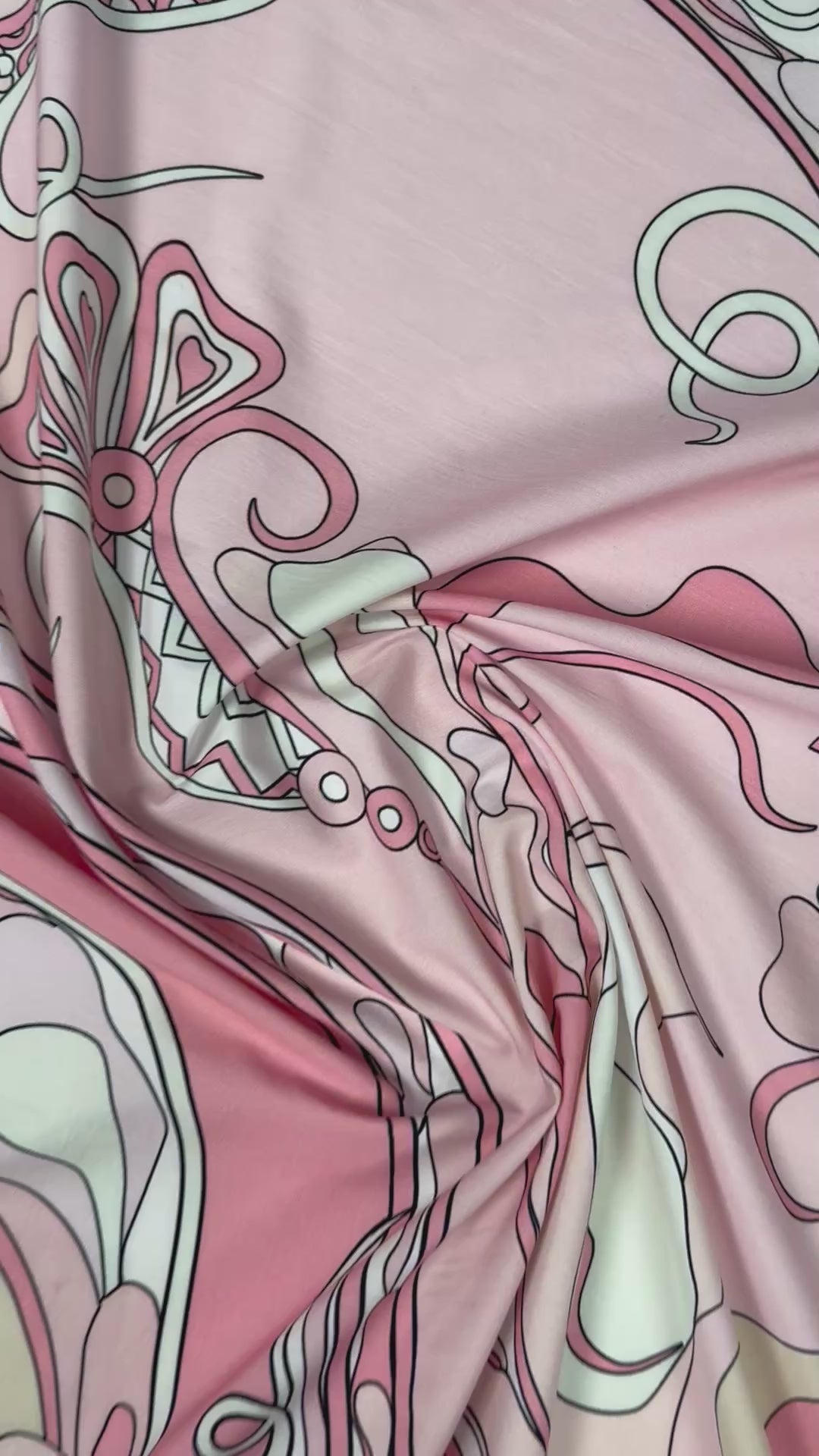 نقشة دوامية وردية زاهية على قماش بوبلين قطني عضوي مسامي. سطح ناعم وسهل الخياطة، مثالي للفساتين والقمصان.