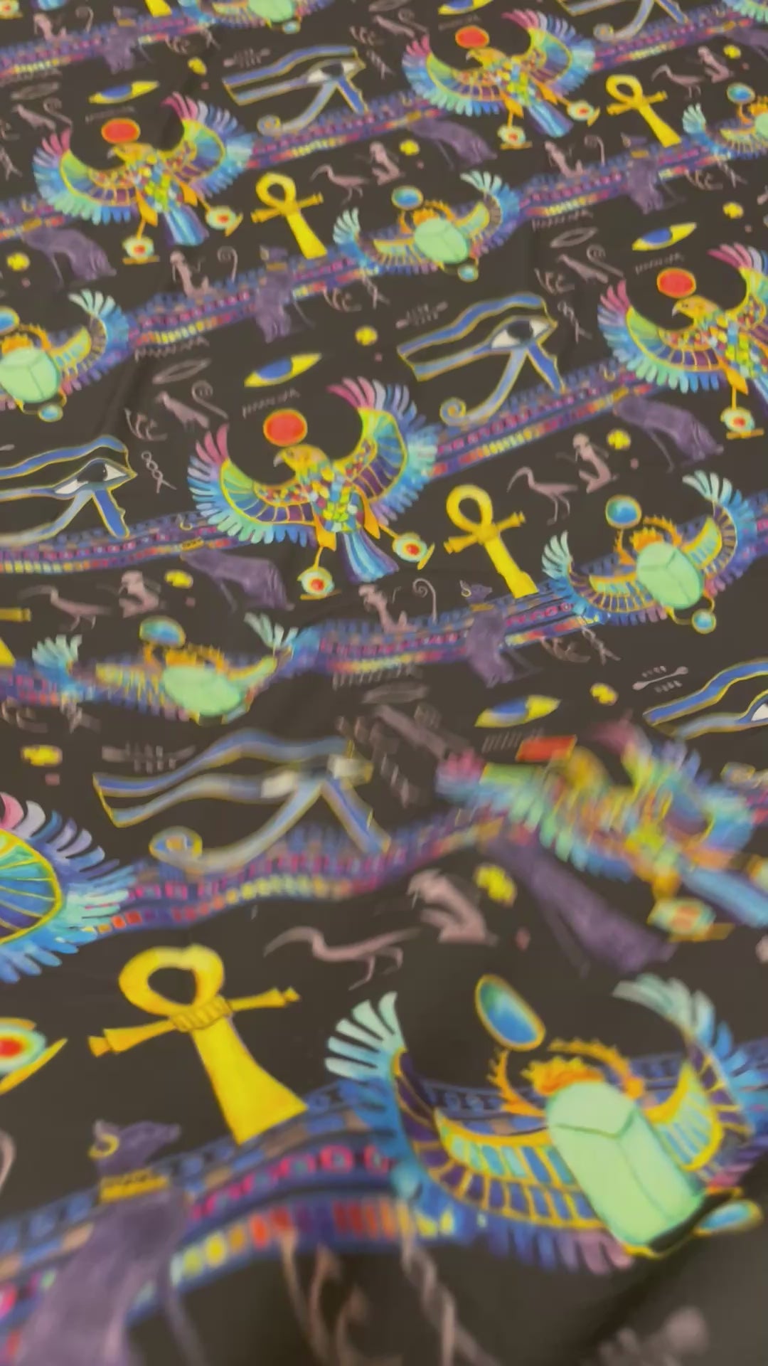 اكتشف قماش الكريب المُزيّن بالرموز المصرية، وعين حورس، والكتابات الهيروغليفية. مثالي للأزياء والفساتين والحرف اليدوية. جودة فاخرة، وطباعة فريدة.