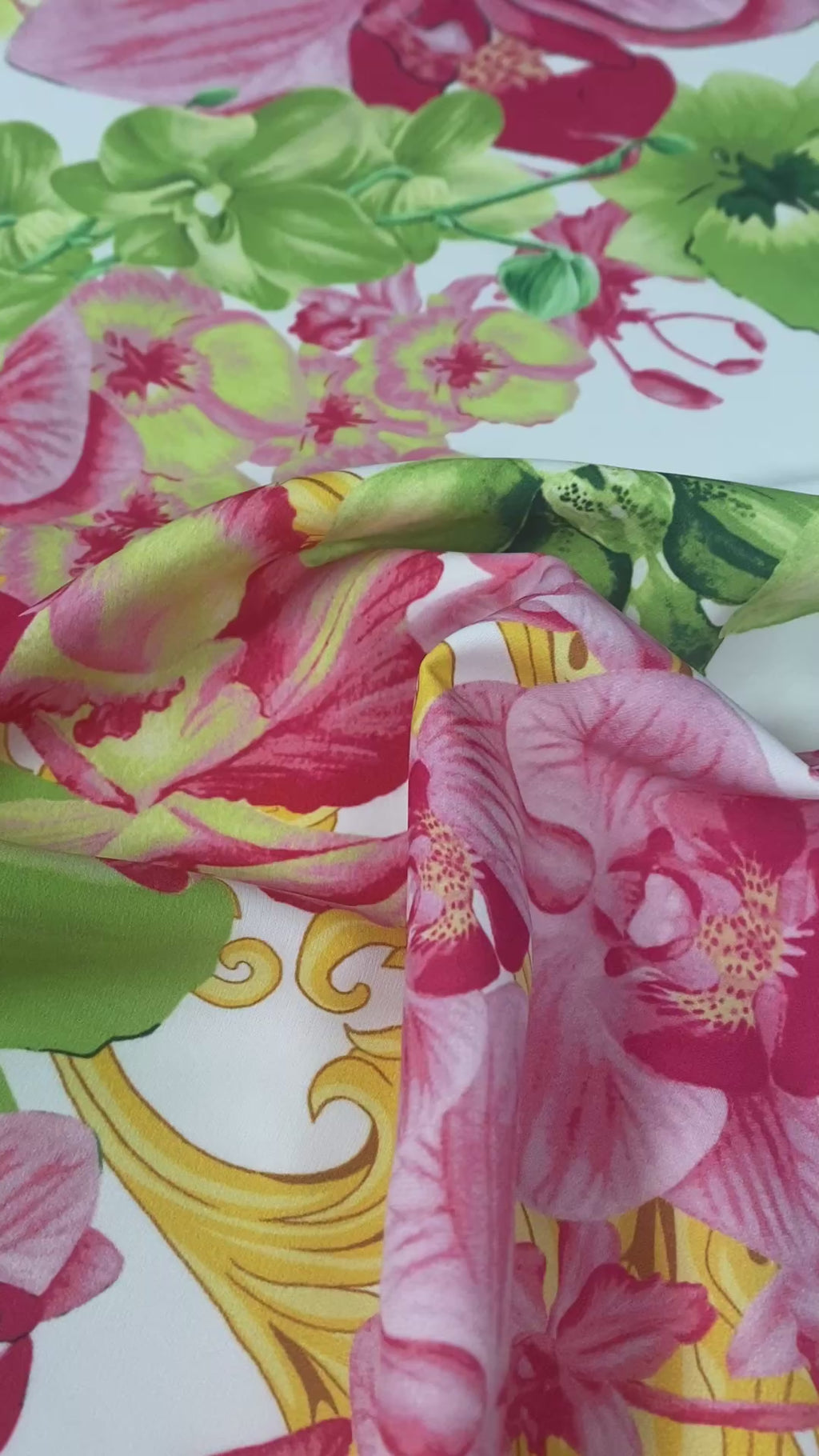 قماش كريب خفيف الوزن بزهور أوركيد وردية زاهية، وأوراق خضراء، ولمسات ذهبية على قاعدة بيضاء ناعمة. ثنيات ناعمة، ومثالي للفساتين والبلوزات والأوشحة. يُباع بالمتر.
