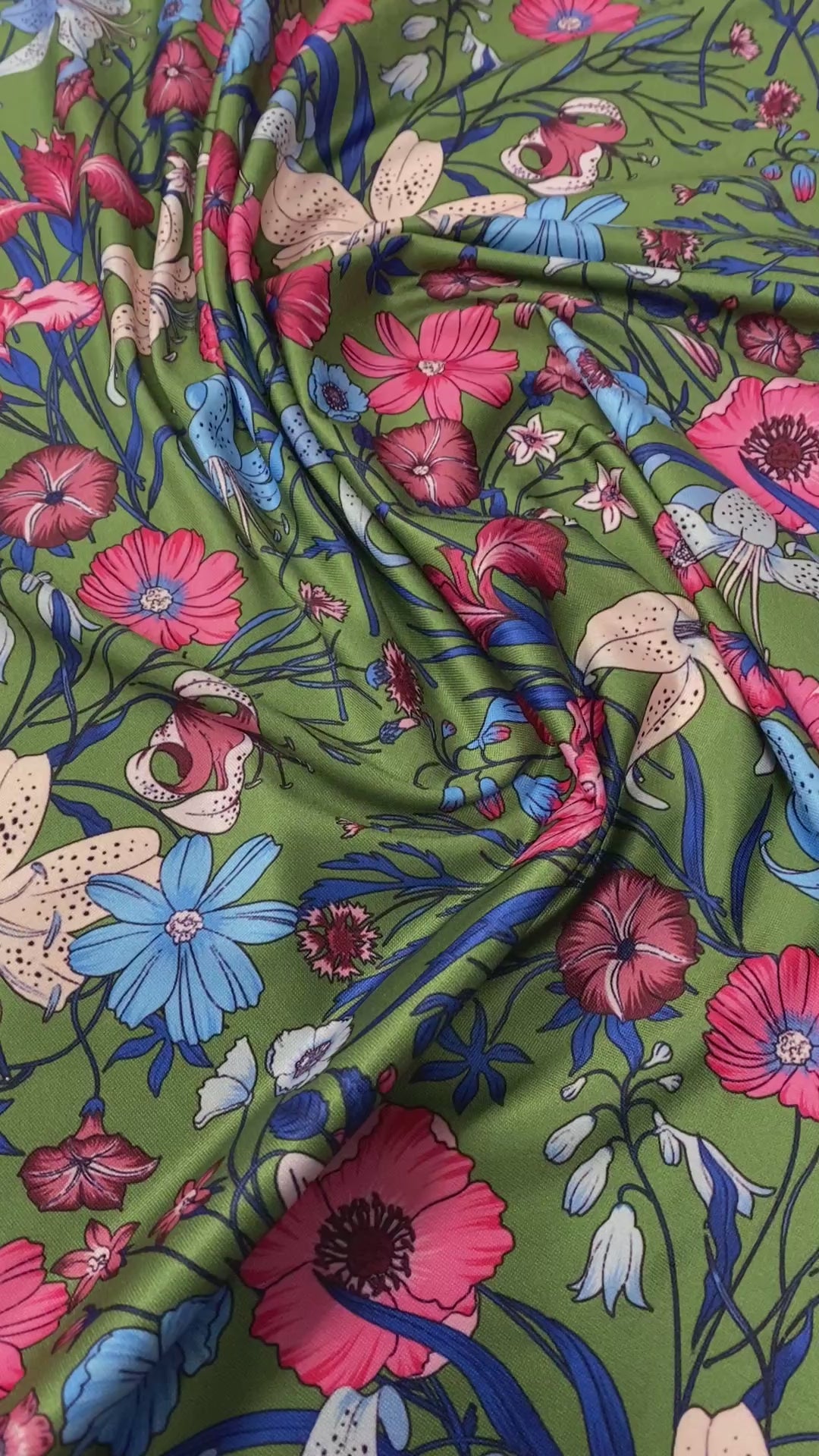 قماش سباندكس زهري نابض بالحياة بقاعدة خضراء وأزهار متعددة الألوان. قماش مطاطي مثالي للفساتين والقمصان والسراويل الضيقة ومشاريع الخياطة الإبداعية.