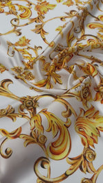 قماش ساتان فاخر بطبعة باروكية ذهبية، بلمسة نهائية ناعمة ولامعة. مثالي للفساتين والبلوزات والتنانير وقطع الأزياء المميزة ذات التصميم الأنيق. يُباع بالمتر.