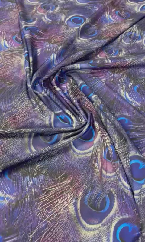 قماش أنيق بطبعة ريش الطاووس، بدرجات لونية زرقاء وأرجوانية لامعة. مثالي للفساتين والبلوزات والأشغال اليدوية والمشاريع الزخرفية الرائعة.