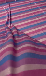 قماش مخطط وردي وأزرق مرح، مزين بترتر رقيق وثنيات ناعمة. مثالي لفساتين الصيف، والقمصان، وملابس الأطفال، ولمشاريع الخياطة الإبداعية الممتعة.