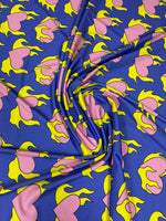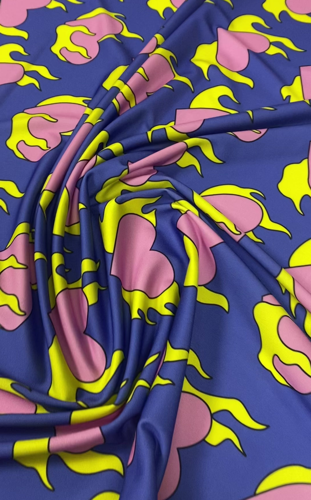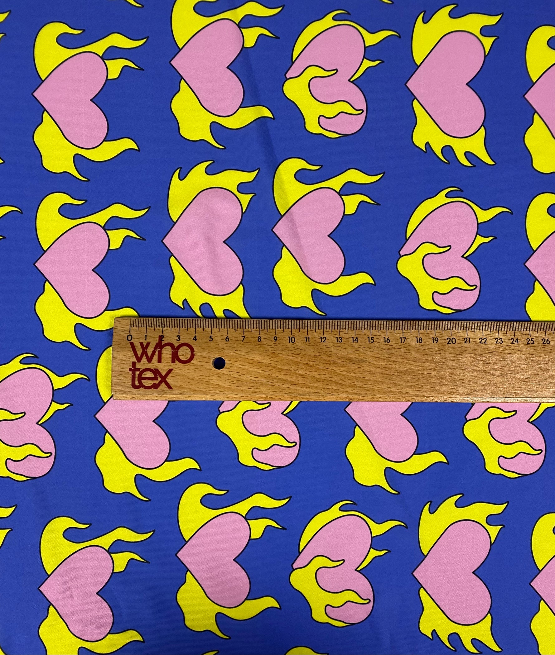 قماش قلوب وردية وألسنة لهب صفراء - قماش مطبوع حسب الطلب على الساتان أو الكريب أو الإسباندكس أو الشيفون