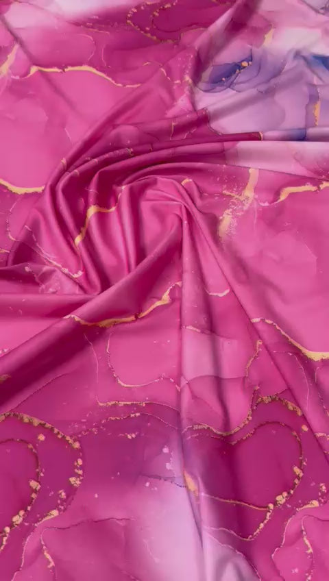قماش ساتان ناعم بتأثير رخامي وردي وأرجواني نابض بالحياة، معزز بعروق ذهبية رقيقة. لامع، خفيف الوزن، مثالي للفساتين والبلوزات والأوشحة. يُباع بالمتر.