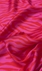 قماش ساتان بطبعة حمار وحشي بلون وردي-أحمر جريء، بلمسة نهائية ناعمة ولامعة. مثالي للفساتين والبلوزات والتنانير وقطع الأزياء المميزة بفضل ثنياته الناعمة. يُباع بالمتر.