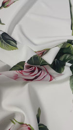 قماش كريب خفيف الوزن بنقشات ورود وردية ناعمة على قاعدة بيضاء نقية. ناعم، انسيابي، مثالي للفساتين والبلوزات والأوشحة. يُباع بالمتر.
