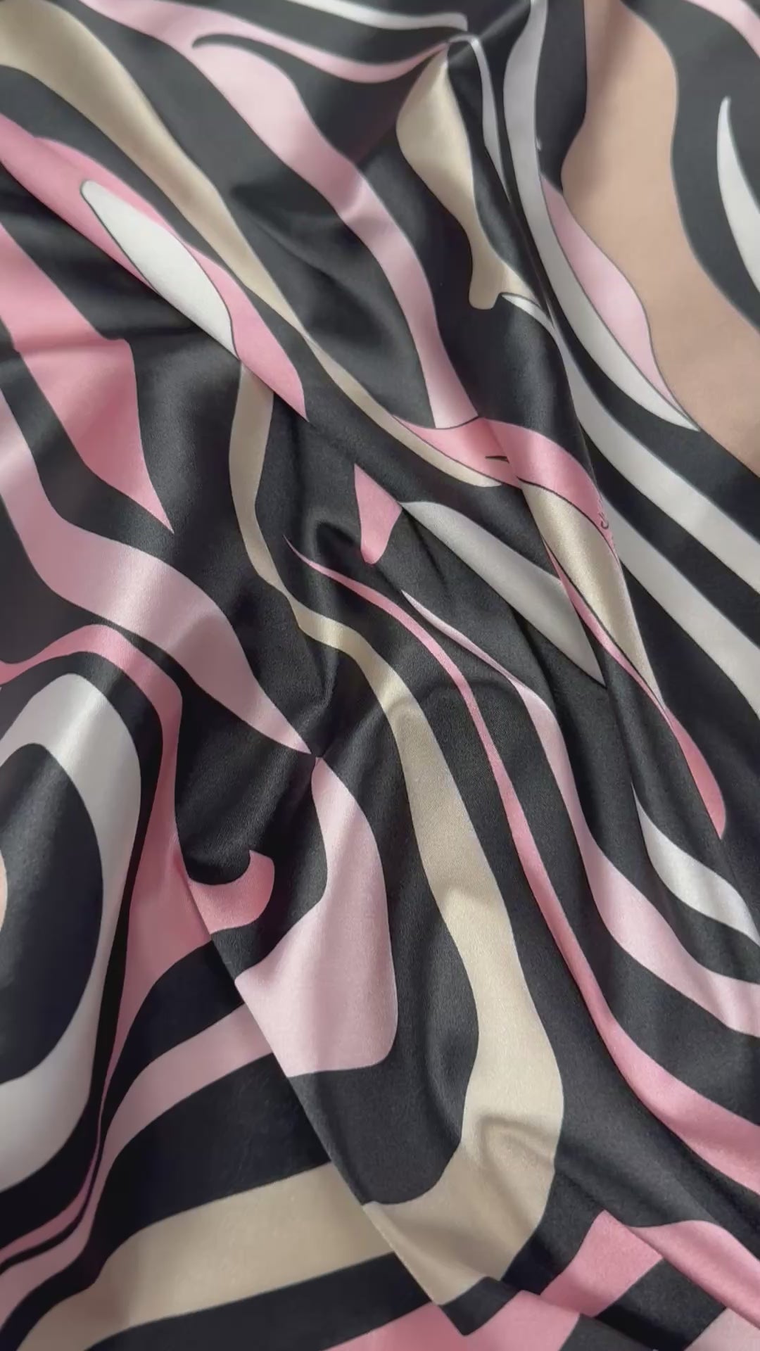 قماش ساتان ناعم من الليكرا بنقوش مموجة وردية وبيج وسوداء. لامع ومرن، مثالي للفساتين والبلوزات والتنانير ومشاريع الخياطة الأنيقة. يُباع بالمتر.