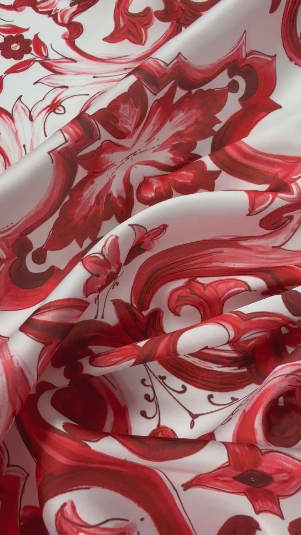 قماش ساتان فاخر بنقوش باروكية حمراء جريئة وثنيات ناعمة وأنيقة. مثالي للفساتين والبلوزات والتنانير وتصاميم الأزياء المميزة. يُباع بالمتر.