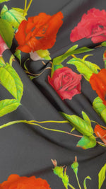 ورود حمراء ووردية على قماش بوبلين قطني عضوي أسود بالمتر
