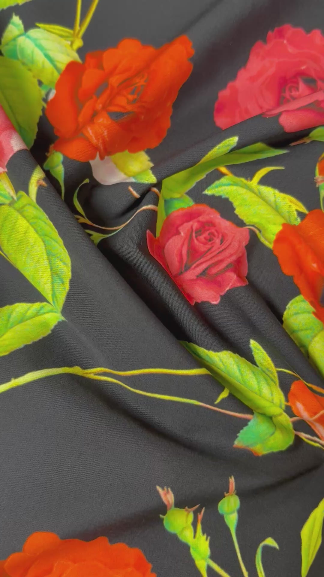 ورود حمراء ووردية رومانسية على خلفية سوداء داكنة، مطبوعة على قماش بوبلين قطني عضوي. تصميم رائع، يسمح بمرور الهواء، ومثالي للفساتين والبلوزات.