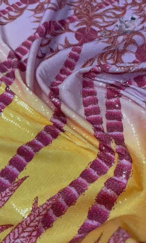 قماش بطبعة نخيل استوائي نابض بالحياة، بتدرج وردي-أصفر، وثنيات ناعمة. مثالي لفساتين الصيف، وملابس الشاطئ، وأزياء المنتجعات، ومشاريع الخياطة الإبداعية.
